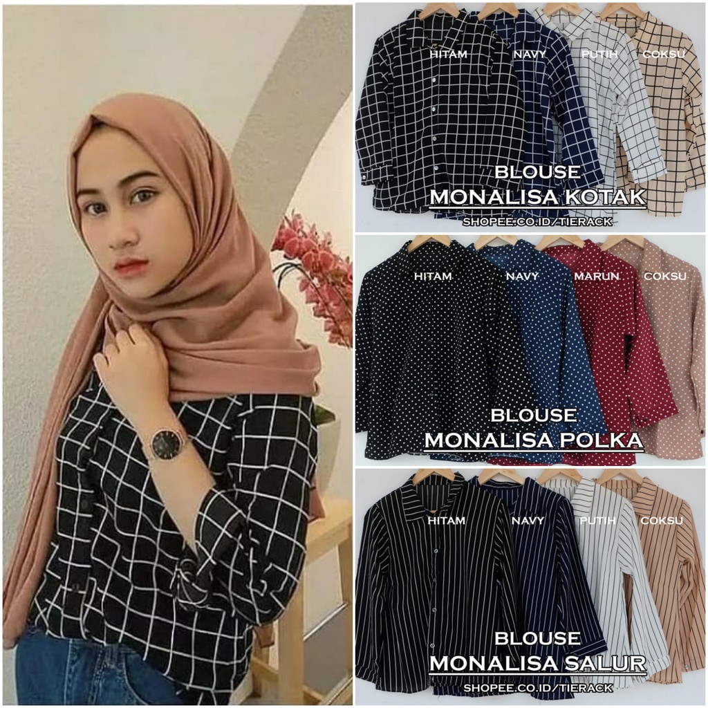 Sq ori tunik kemeja kotak hitam putih hijab baju muslim kerja kantor wanita murah tangan panjang trendy modis elegan simple modern katun.